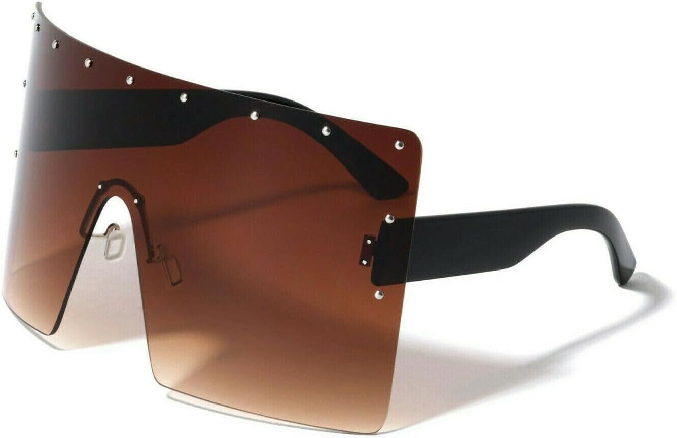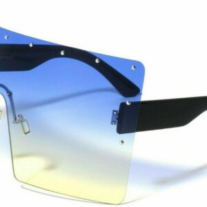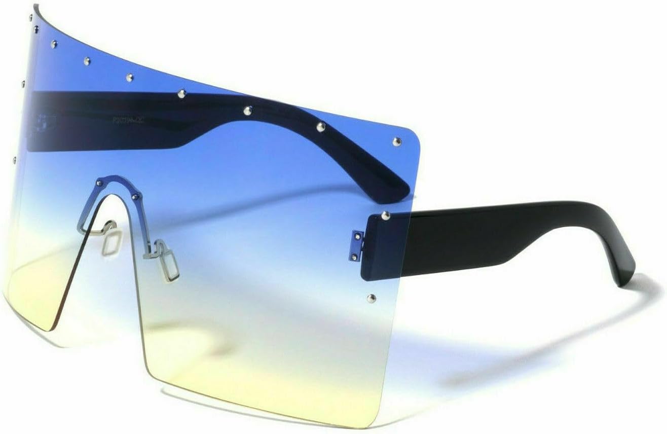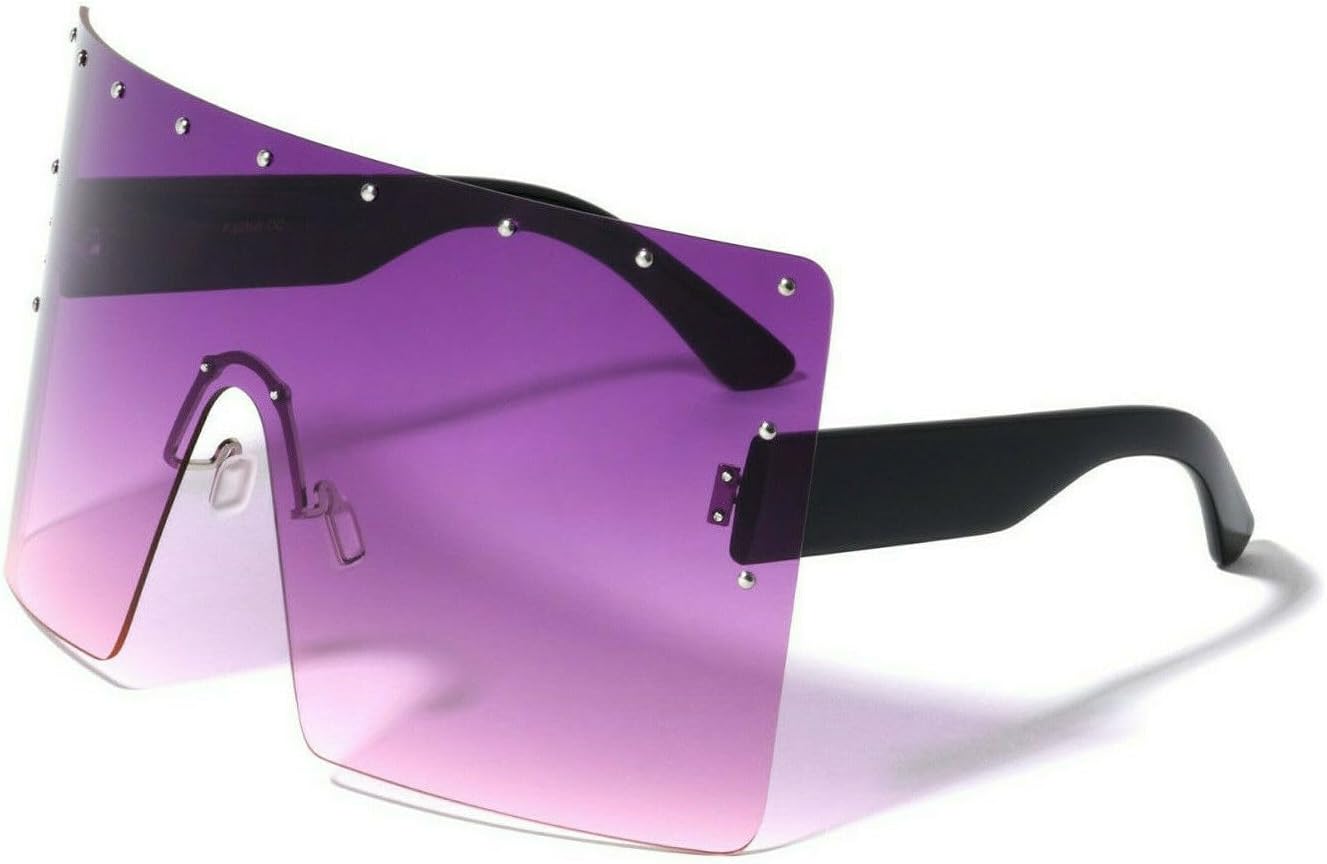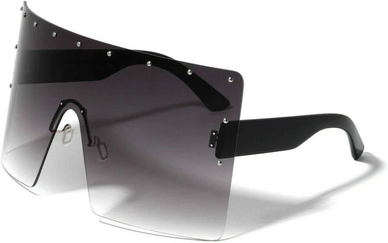 XXL Huge Oversized Rimless One Piece Shield Lens Wrap Around Flat Top Studded Sunglasses by Dweebzilla are an inexpensive alternative to high end, name brand designer shades at a fraction of the price. Design features a retro inspired plastic frame with oversized, rimless, wrap around, one piece gradient lens. These shades are perfect for people with an active lifestyle who enjoy sports like volleyball, baseball & golf or any other outdoor activities like the beach, snowboarding or any other occasion.