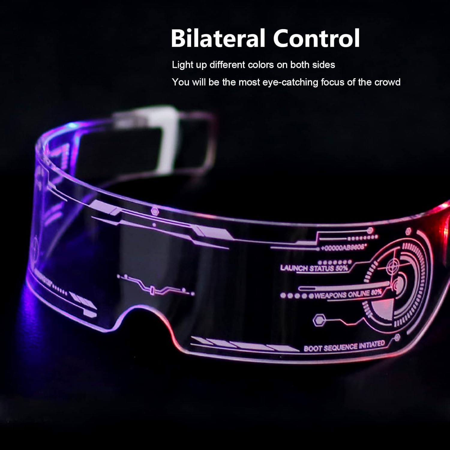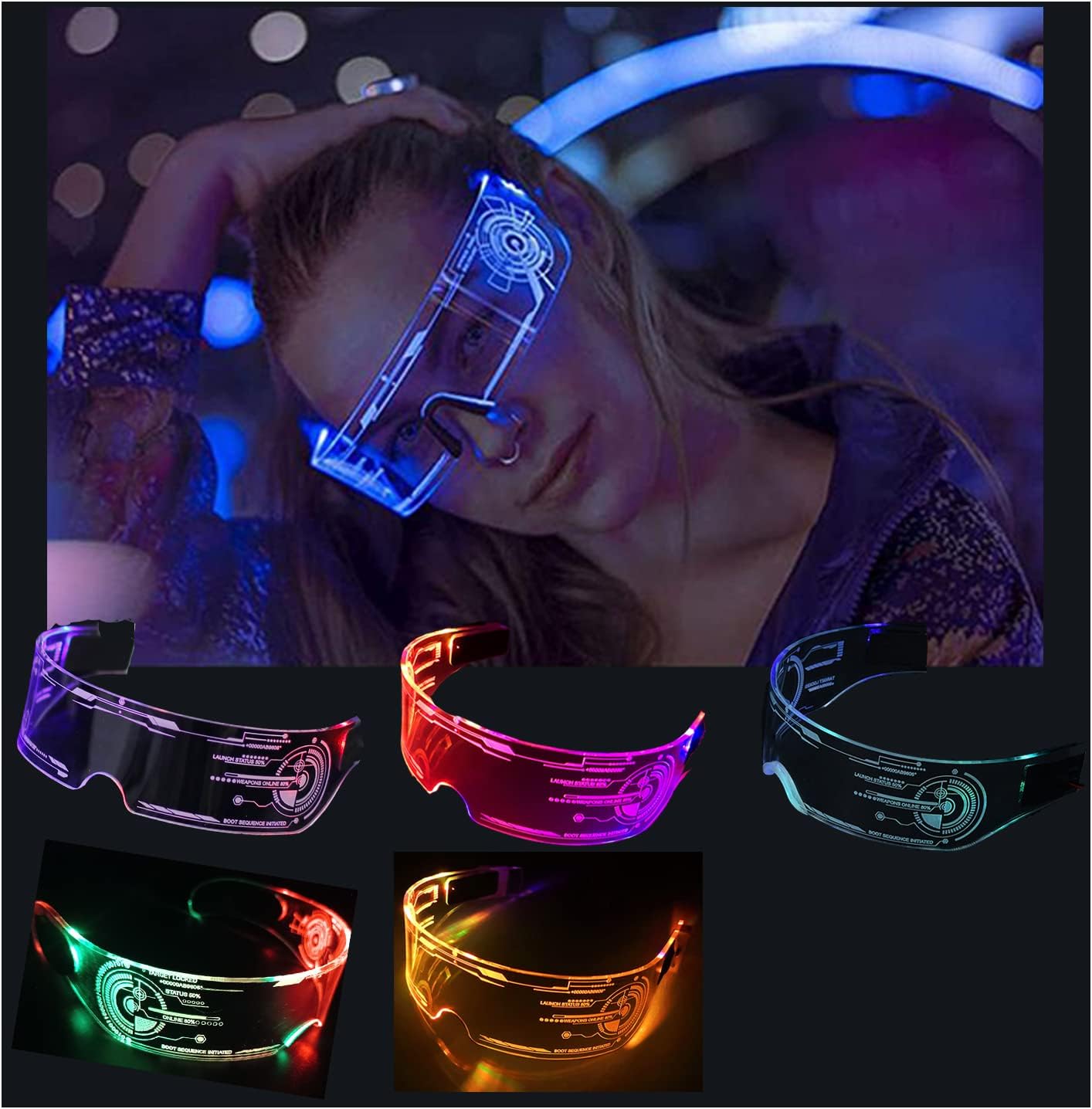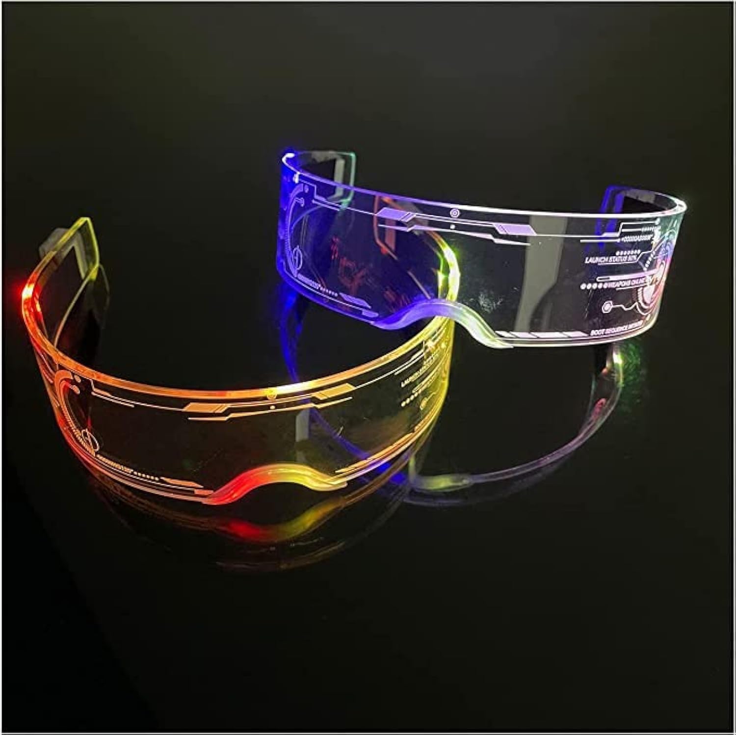 - Multi-colored In One— The futuristic glasses(2 modes) have 7 controllable lights and 7 gradient flashing colors when in blinking mode. The biggest feature of our LED glasses is bilateral control, different colors on both sides will be cooler. (Warm tips: Press the button to turn on, change color/ mode and turn off. In sequence will be: turning on, blue, green, red, sky blue, yellow, purple, white, 7 colors blinking and turning off)